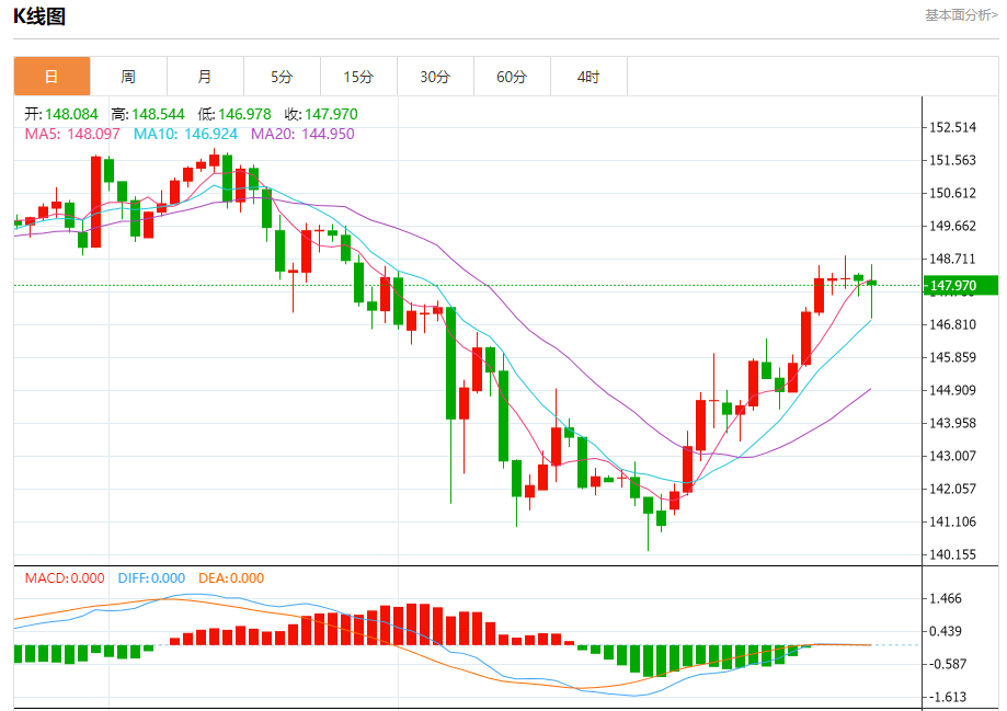 汇价高见148.544,低见146.971。上一交易日,汇价收于148.093。