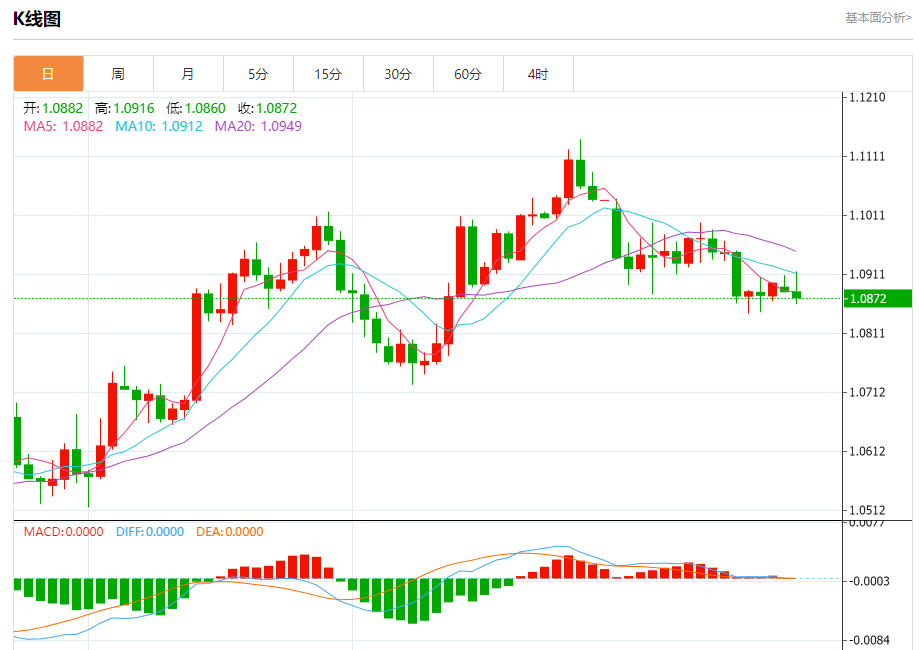 汇价高见1.0916,低见1.0860。上一交易日,汇价收于1.0882。
