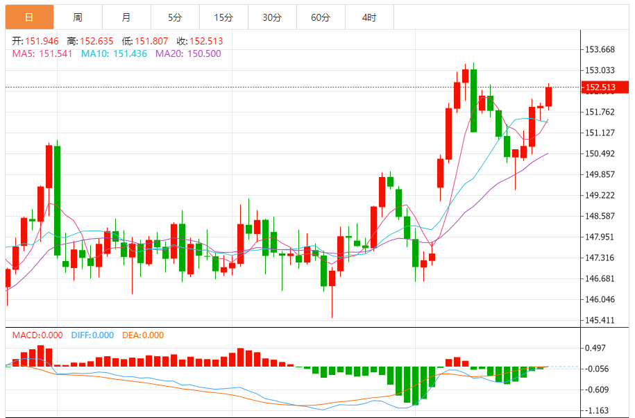 周四(10月23日),美元/日元上涨152.533,暂报152.505,涨幅0.37%。