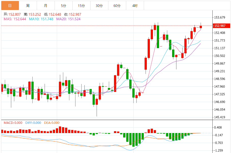 周一(10月27日),美元/日元上涨152.994,暂报152.984,涨幅0.09%。