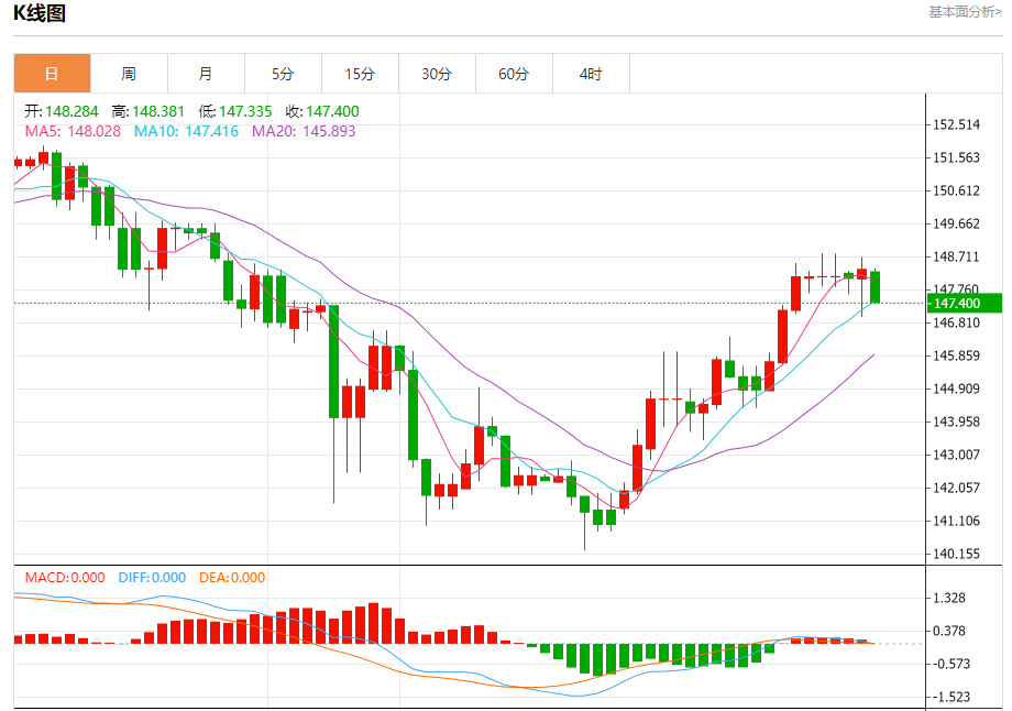 汇价高见148.381,低见147.335。上一交易日,汇价收于148.355。