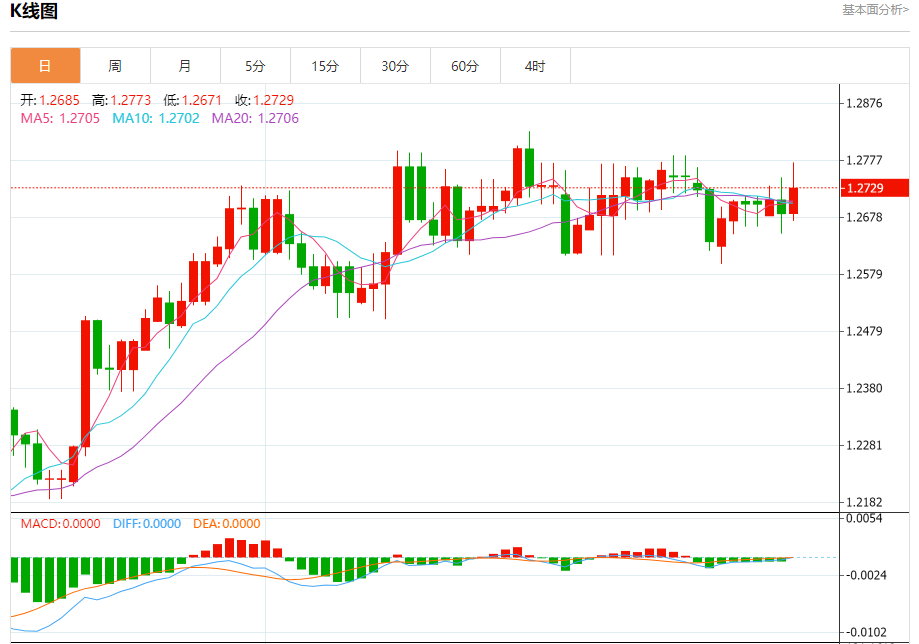 汇价高见1.2773,低见1.2671。上一交易日,汇价收于1.2685。