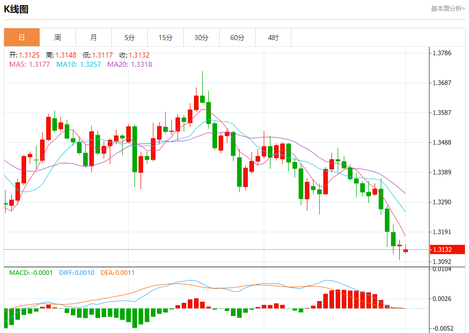 汇价高见1.3149,低见1.3117。上一交易日,汇价收于1.3147。
