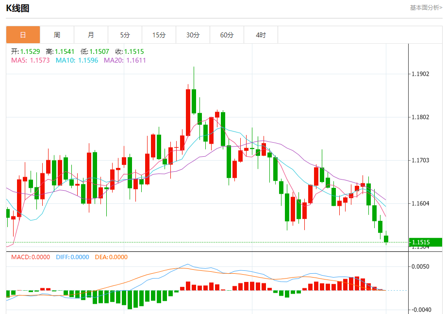 汇价高见1.1541,低见1.1508。上一交易日,汇价收于1.1536。