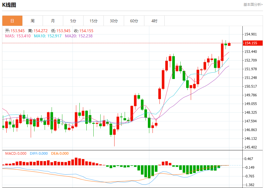 汇价高见154.272,低见153.945。上一交易日,汇价收于154.053。
