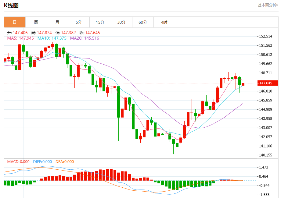 汇价高见147.875,低见147.382。上一交易日,汇价收于147.488。