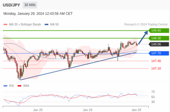 在 147.70 之上,看涨,目标价位为 148.30 ,然后为 148.60 。