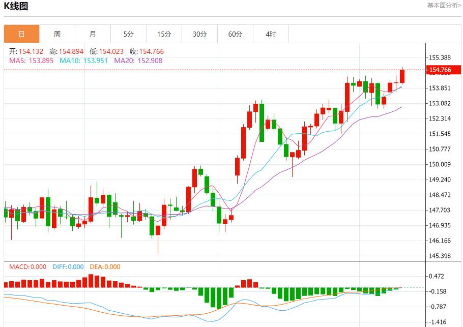 汇价高见154.894,低见154.023。上一交易日,汇价收于154.135。