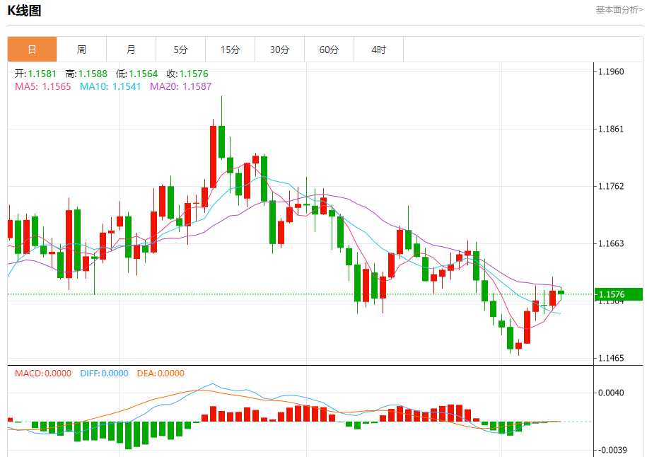汇价高见1.1588,低见1.1564。上一交易日,汇价收于1.1582。