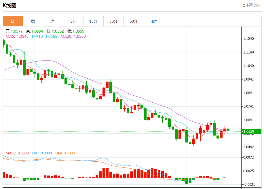 汇价高见1.0594,低见1.0552。上一交易日,汇价收于1.0577。