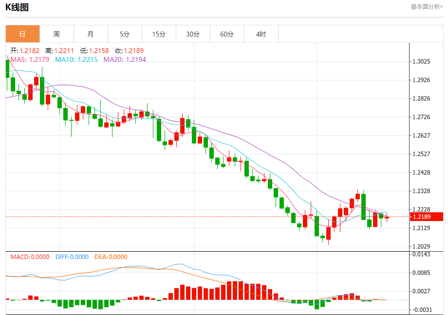 汇价高见1.2211,低见1.2158。上一交易日,汇价收于1.2182。