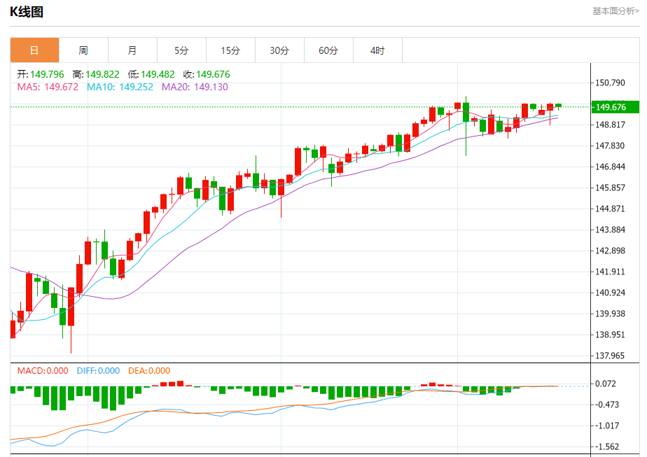 汇价高见149.822,低见149.482。上一交易日,汇价收于149.795。