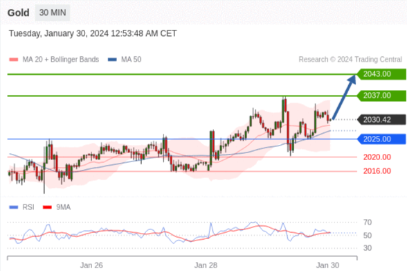 在 2025.00 之上,看涨,目标价位为 2037.00 ,然后为 2043.00 。
