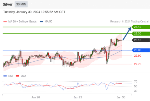 在 23.00 之上,看涨,目标价位为 23.30 ,然后为 23.42 。