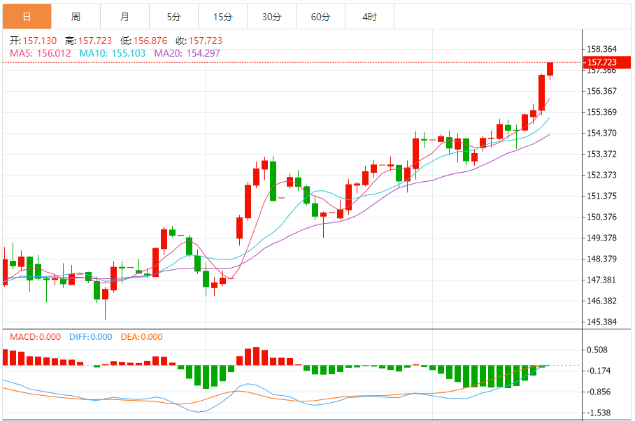 周四(11月20日),美元/日元上涨157.739,暂报157.725,涨幅0.38%。