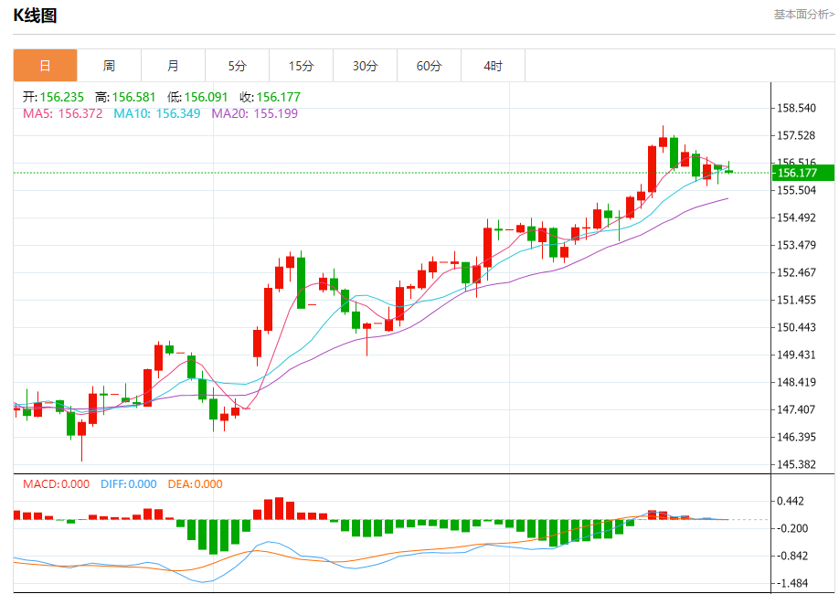 汇价高见156.569,低见156.087。上一交易日,汇价收于156.258。