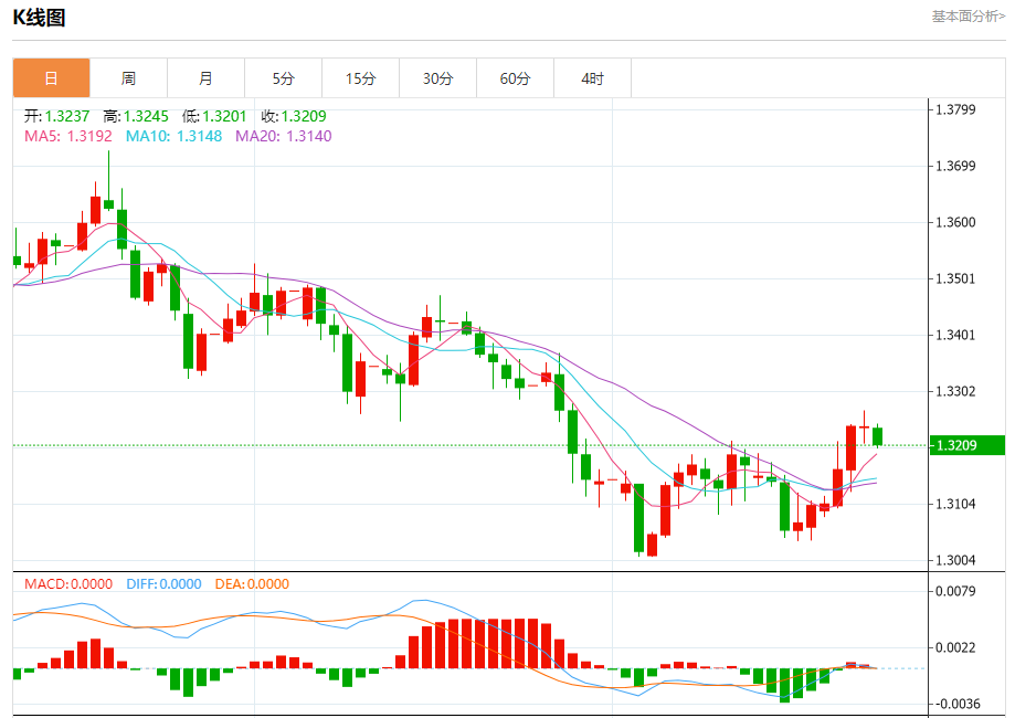 汇价高见1.3244,低见1.3200。上一交易日,汇价收于1.3237。