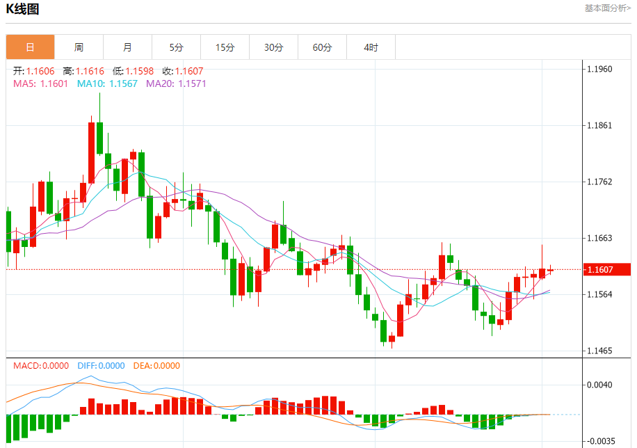 汇价高见1.1616,低见1.1598。上一交易日,汇价收于1.1609。
