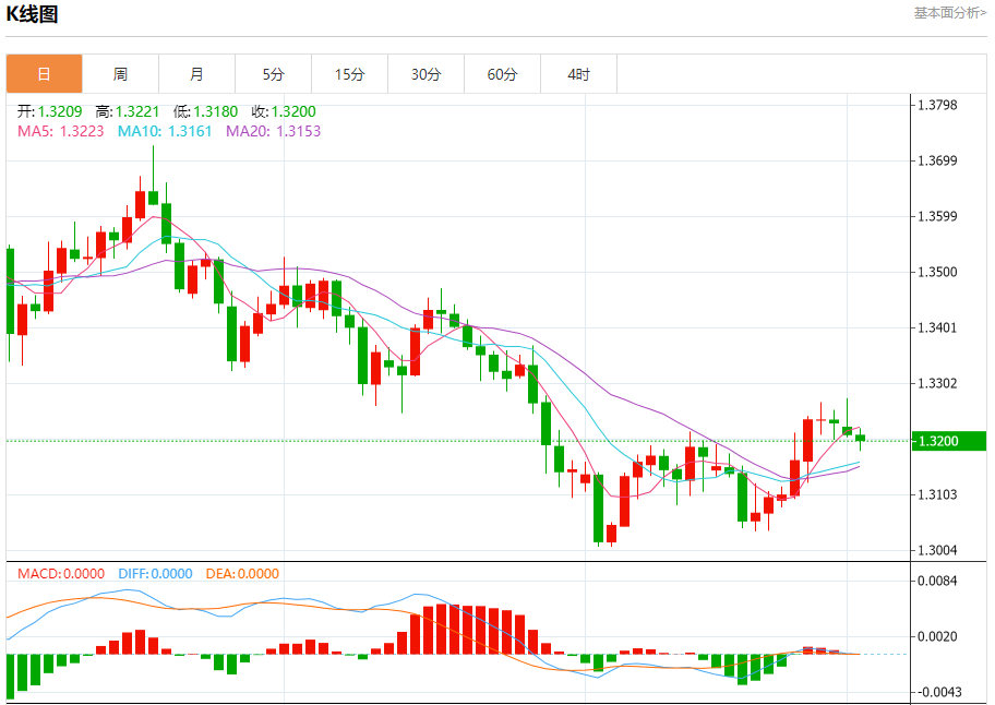 汇价高见1.3221,低见1.3180。上一交易日,汇价收于1.3212。