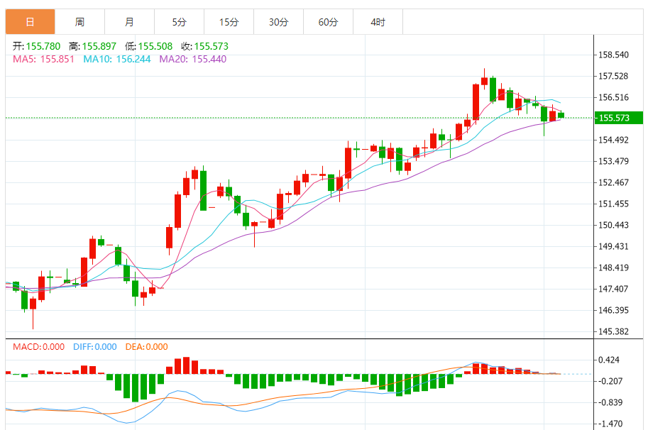 周三(12月3日),美元/日元下跌155.592,暂报155.584,跌幅0.18%。