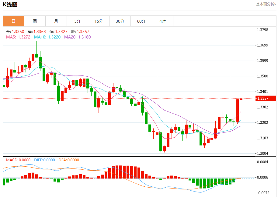 汇价高见1.3363,低见1.3327。上一交易日,汇价收于1.3352。