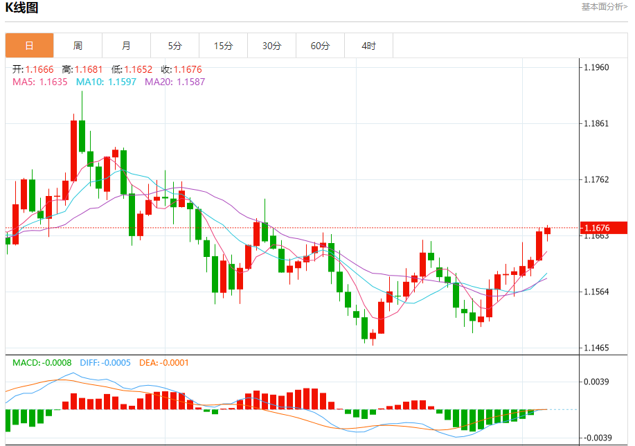 汇价高见1.1682,低见1.1653。上一交易日,汇价收于1.1671。