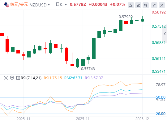 另一方面,纽元仍受到中国周一公布的强劲贸易数据支撑。中国是新西兰的主要贸易伙伴,11月中国报告的贸易顺差超过1万亿美元,主要得益于出口同比增长5.9%。这些数据提升了人们对世界第二大经济体的信心,并改善了对新西兰经济前景的预期。
