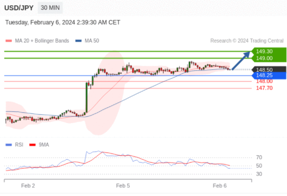 在 148.25 之上,看涨,目标价位为 149.00 ,然后为 149.30 。
