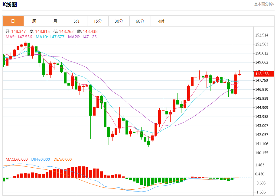 汇价高见148.815,低见148.263。上一交易日,汇价收于148.375。