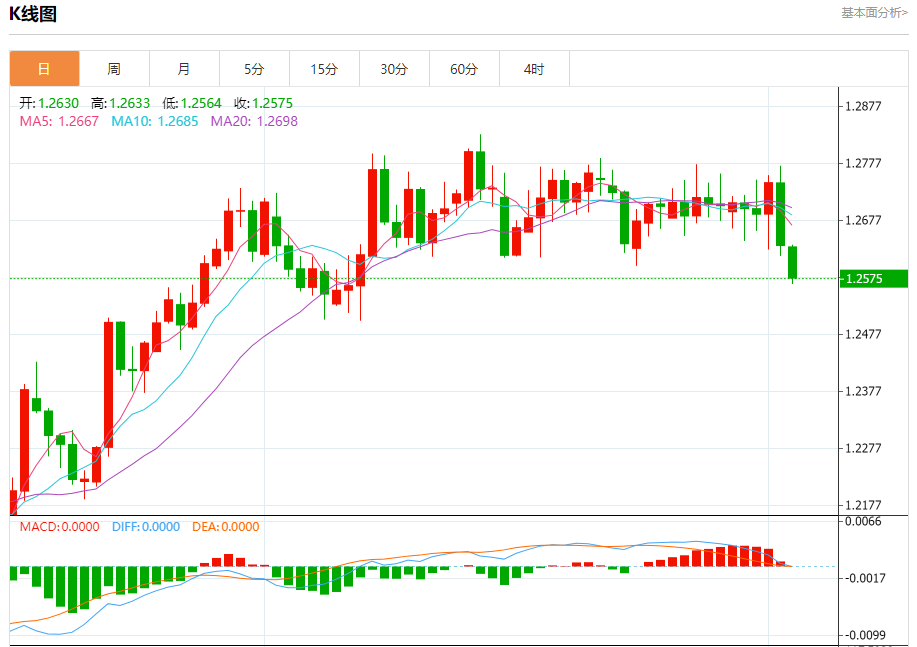 汇价高见1.2633,低见1.2564。上一交易日,汇价收于1.2633。