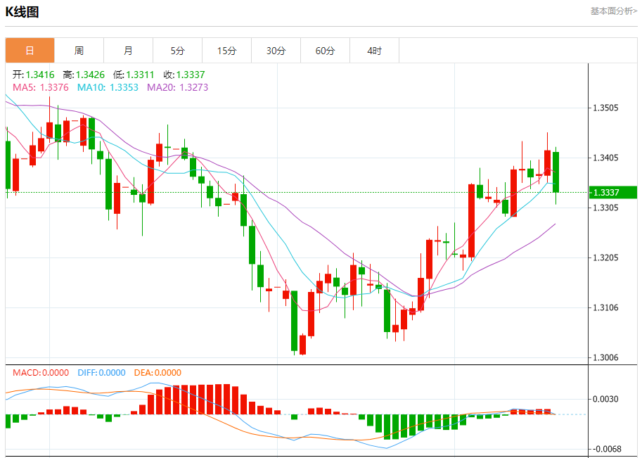 汇价高见1.3426,低见1.3311。上一交易日,汇价收于1.3419。