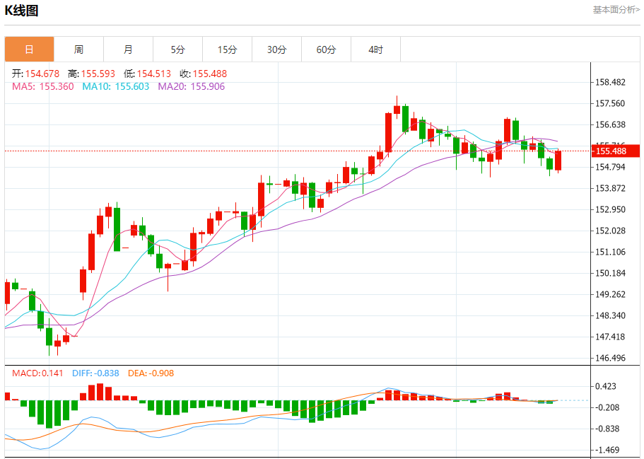 汇价高见155.584,低见154.503。上一交易日,汇价收于154.714。