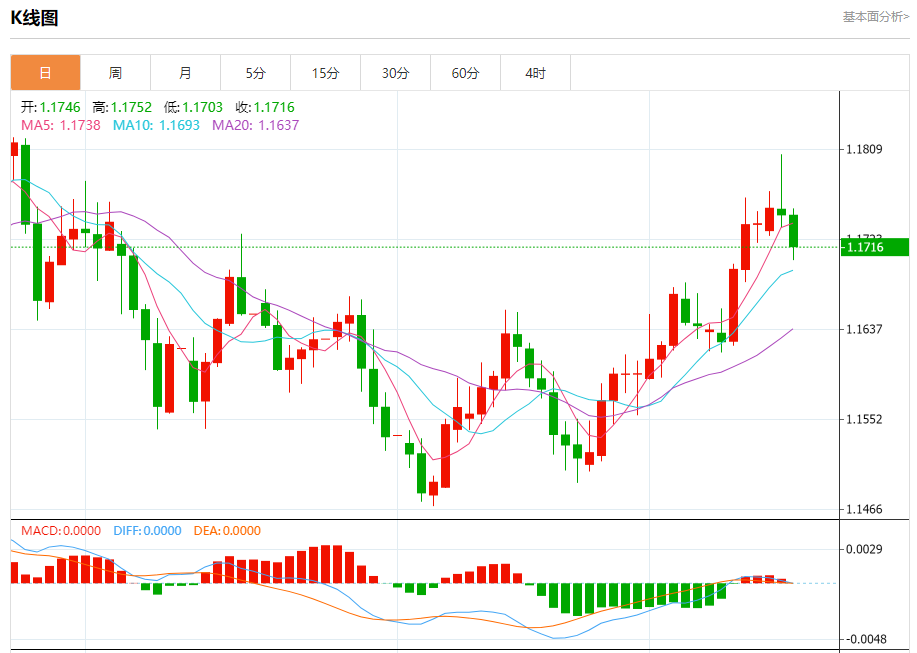 汇价高见1.1752,低见1.1702。上一交易日,汇价收于1.1746。