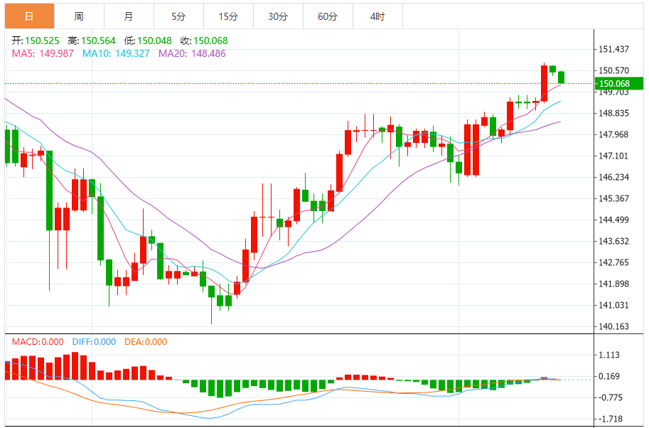 周四(2月15日),美元/日元下跌,暂报150.093,跌幅0.29%。
