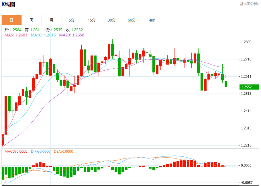汇价高见1.2611,低见1.2535。上一交易日,汇价收于1.2591。