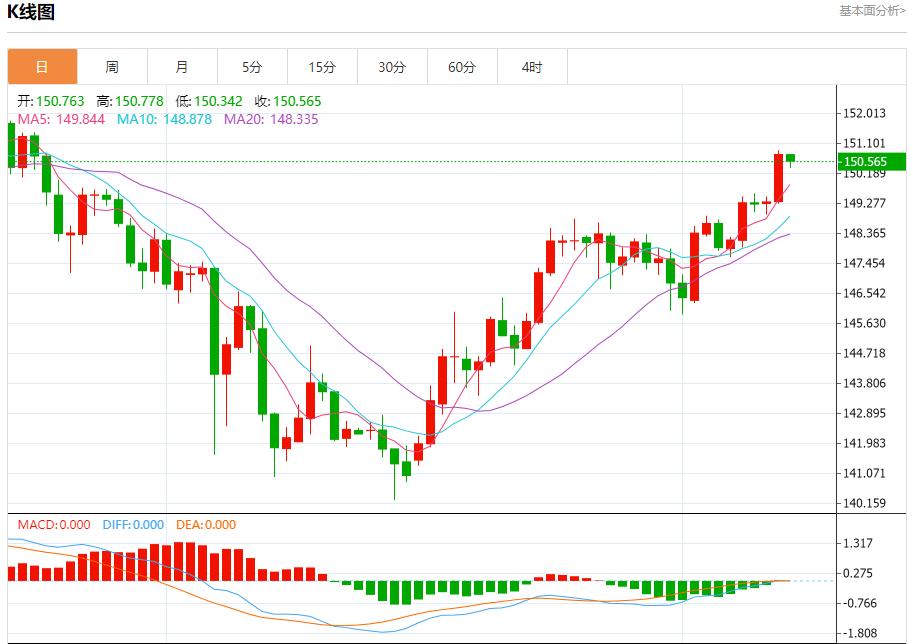 汇价高见150.778,低见150.342。上一交易日,汇价收于150.768。
