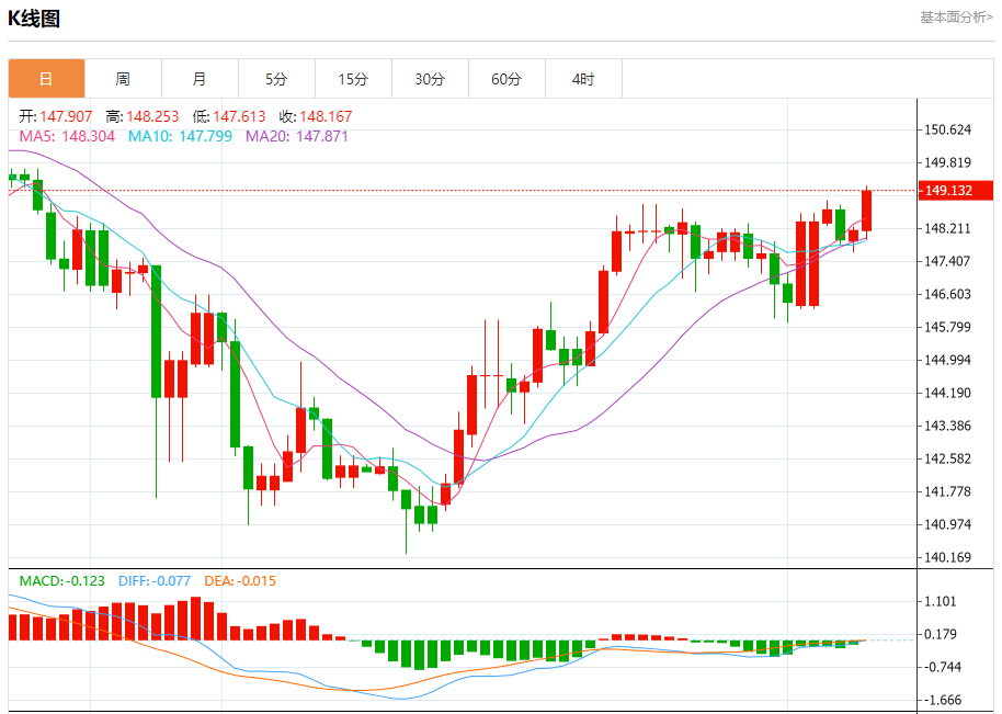 汇价高见149.249,低见147.926。上一交易日,汇价收于148.167。