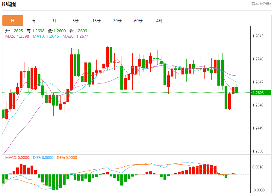 汇价高见1.2638,低见1.2600。上一交易日,汇价收于1.2626。