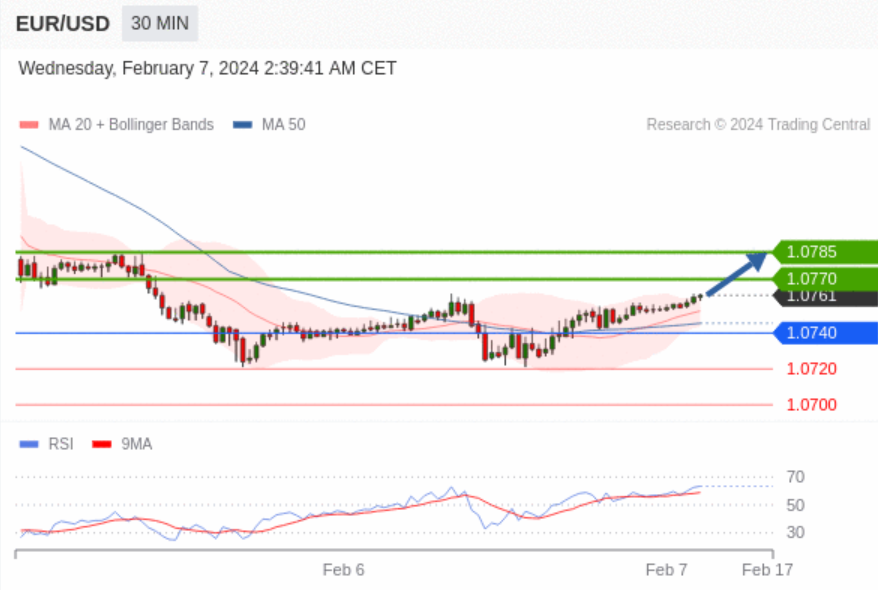在 1.0740 之上,看涨,目标价位为 1.0770 ,然后为 1.0785 。