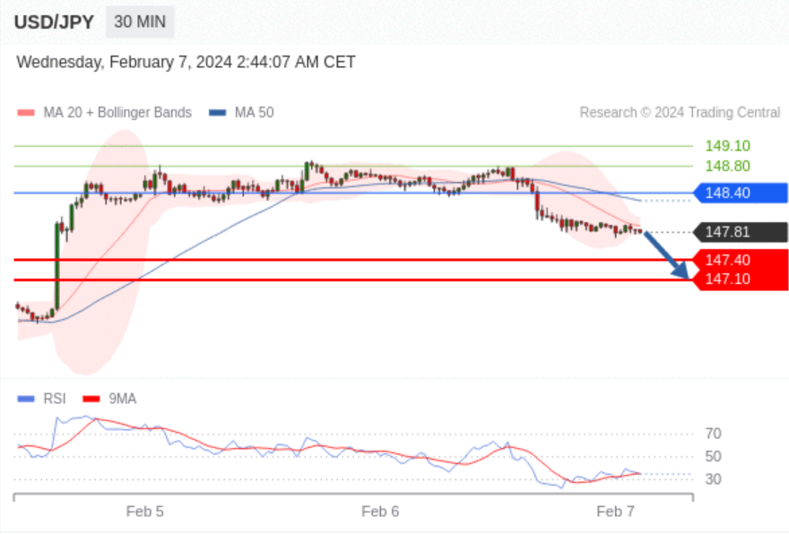 在 148.40 之下,看跌,目标价位为 147.40 ,然后为 147.10 。