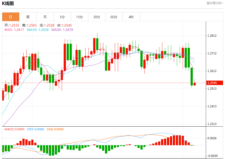 汇价高见1.2565,低见1.2528。上一交易日,汇价收于1.2531。