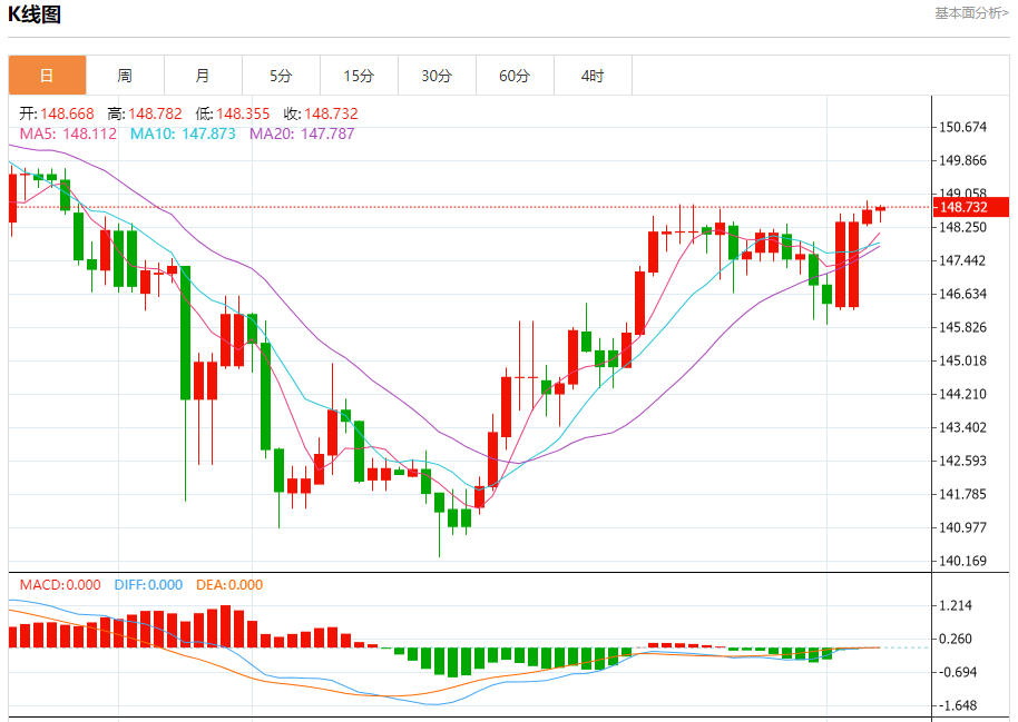 汇价高见148.782,低见148.355。上一交易日,汇价收于148.669。