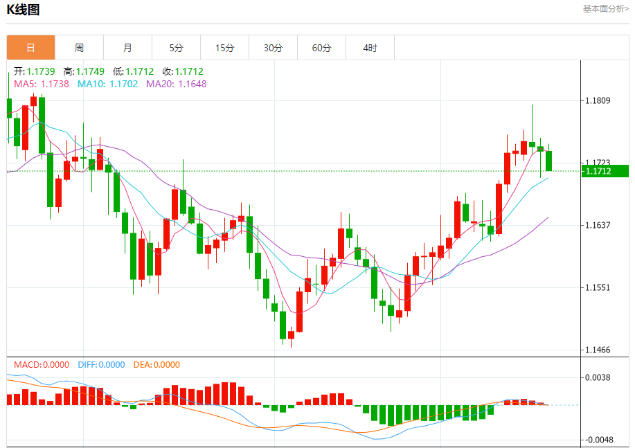 汇价高见1.1749,低见1.1715。上一交易日,汇价收于1.1740。