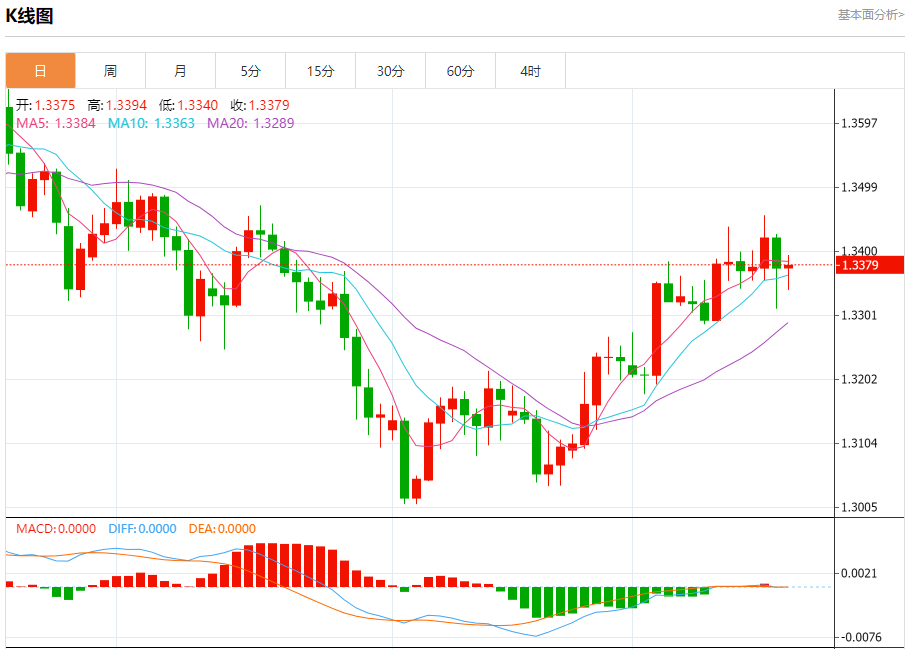 汇价高见1.3394,低见1.3341。上一交易日,汇价收于1.3375。