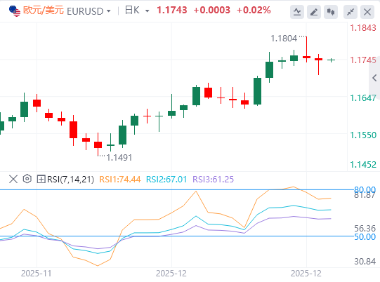 欧元/美元汇对保持在上升的9天和50天指数移动平均线(EMA)之上,强化了看涨倾向。9日均线均位于50日均线之上,且两侧斜率均有所上升。