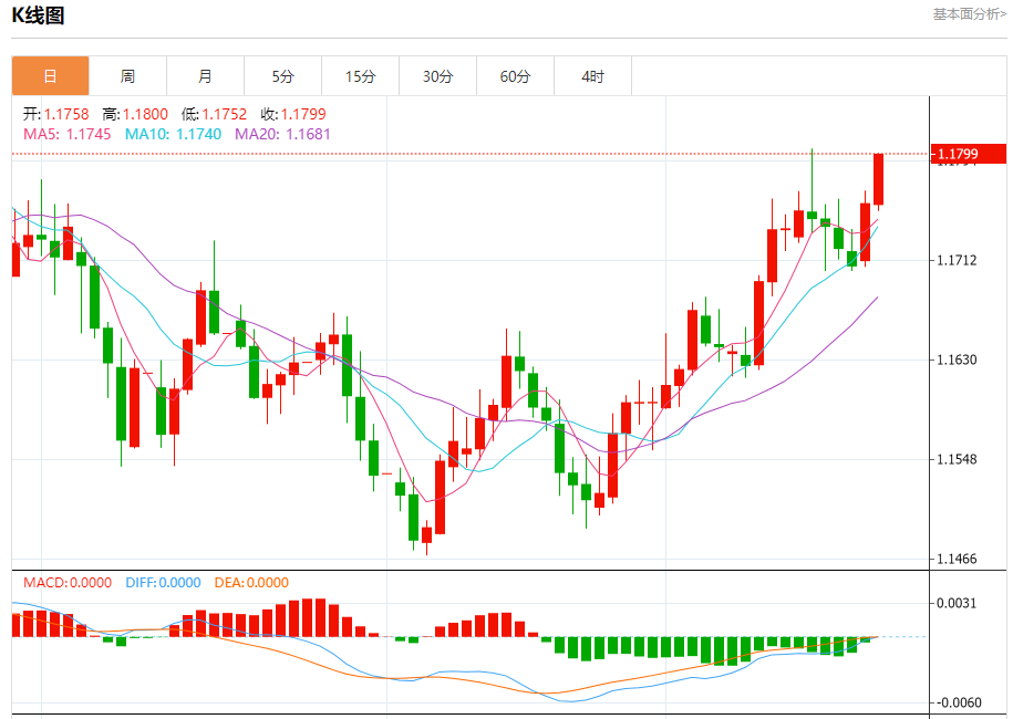汇价高见1.1800,低见1.1752。上一交易日,汇价收于1.1759。