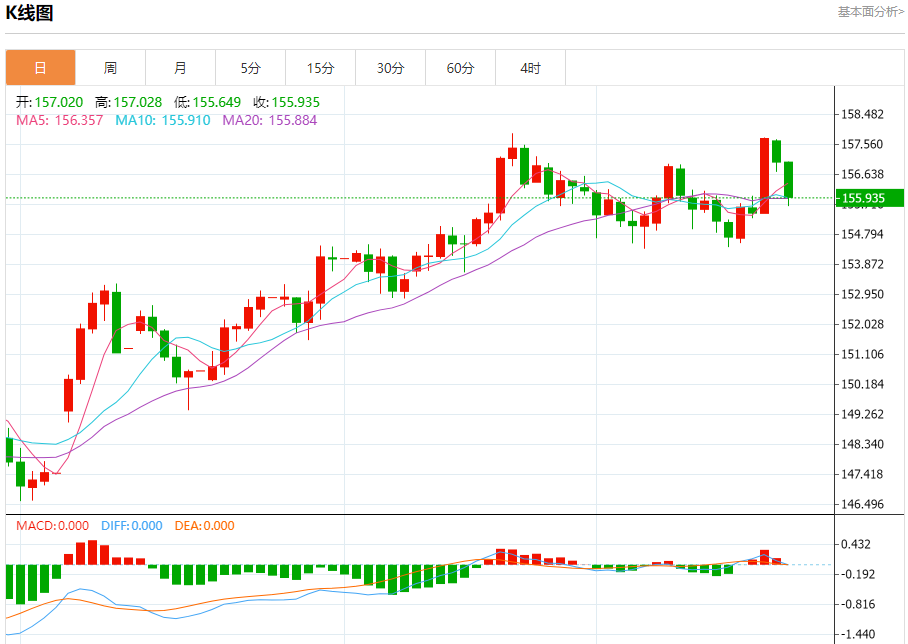 汇价高见157.028,低见155.649。上一交易日,汇价收于157.017。