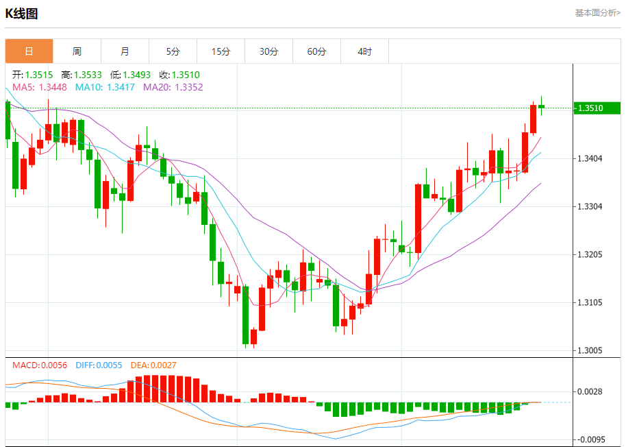 汇价高见1.3534,低见1.3499。上一交易日,汇价收于1.3517。