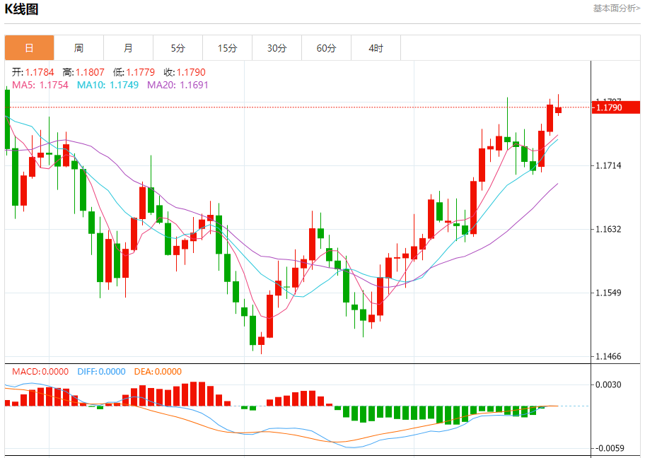 汇价高见1.1807,低见1.1779。上一交易日,汇价收于1.1794。