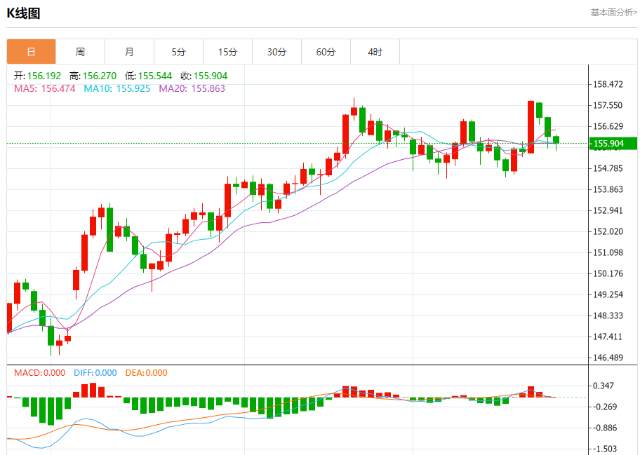汇价高见156.270,低见155.544。上一交易日,汇价收于156.211。